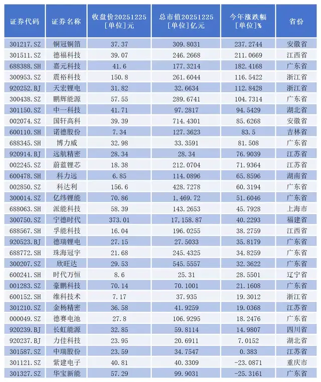 铜冠铜箔(301217.SZ)、德福科技(301511.SZ)、嘉元科技(688388.SH)、震裕科技(300953.SZ)、天宏锂电(920252.BJ)、鹏辉能源(300438.SZ)6家公司年内股价已经成功实现翻倍。