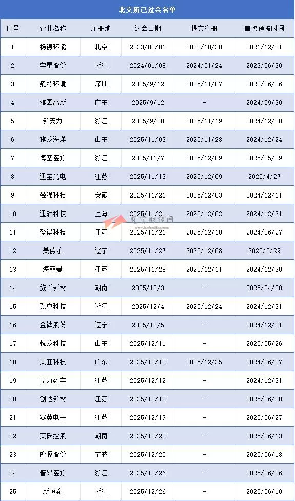 览富财经网讯:截止2025年12月26日北交所过会未拿文企业共25家,14家企业已提交注册,11家企业未提交注册。