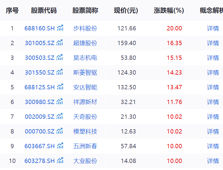 此外,超捷股份(301005.SZ)、昊志机电(300503.SZ)、斯菱智驱(301550.SZ)、安达智能(688125.SH)、祥源新材(300980.SZ)等多股涨超10%。