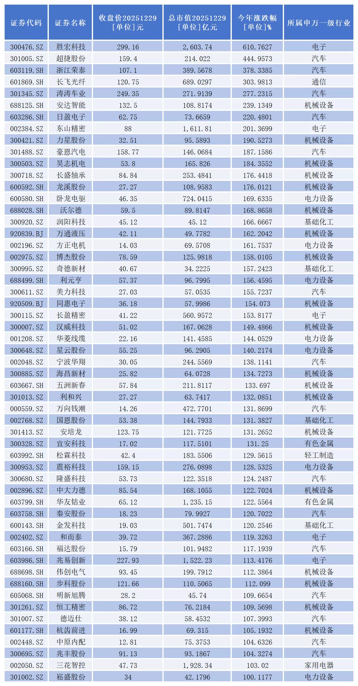 其中,胜宏科技(300476.SZ)、超捷股份(301005.SZ)、浙江荣泰(603119.SH)、长飞光纤(601869.SH)、涛涛车业(301345.SZ)、安达智能(688125.SH)、日盈电子(603286.SH)、东山精密(002384.SZ)8家公司年内股价涨幅均超200%。