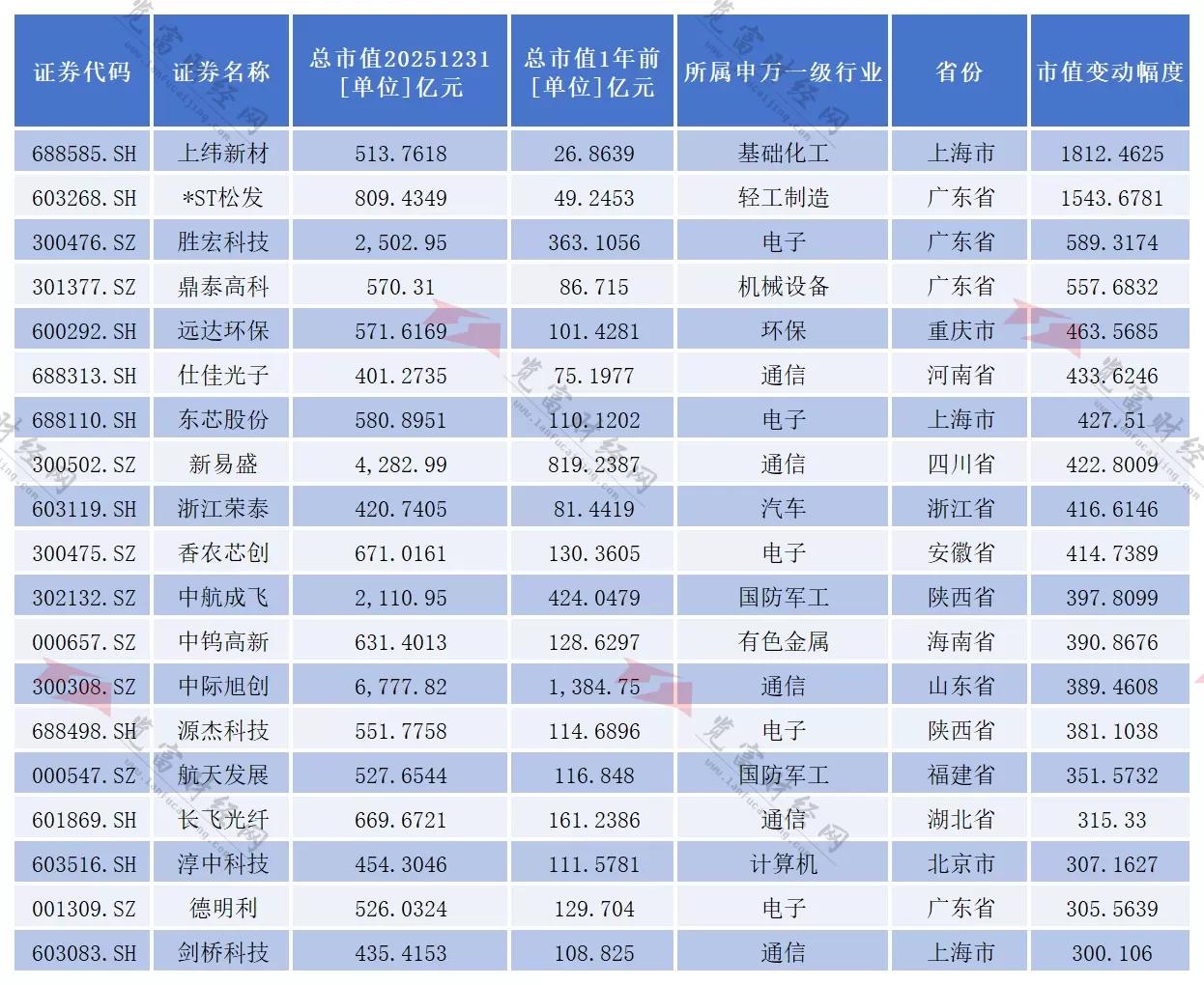 上纬新材(688585.SH)、*ST松发(603268.SH)、胜宏科技(300476.SZ)、鼎泰高科(301377.SZ)、远达环保(600292.SH)、仕佳光子(688313.SH)、东芯股份(688110.SH)、新易盛(300502.SZ)、浙江荣泰(603119.SH)、香农芯创(300475.SZ)、中航成飞(302132.SZ)、中钨高新(000657.SZ)、中际旭创(300308.SZ)、源杰科技(688498.SH)、航天发展(000547.SZ)、长飞光纤(601869.SH)、淳中科技(603516.SH)、德明利(001309.SZ)、剑桥科技(603083.SH)19家公司总市值增幅超过200%。