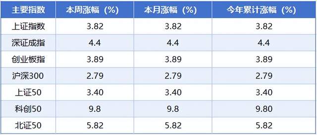 本周(1月5日至1月9日),A股三大指数集体大涨。截至周五收盘,上证指数累计上涨3.82%,深证成指累计上涨4.4%,创业板指累计上涨3.89%。