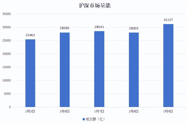 值得关注的是,本周五(2026年1月9日),上证指数高开高走突破4100点,最终收涨0.92%,沪深两市成交额达到3.12万亿,较上一个交易日放量3224亿,时隔73个交易日后再度站上3万亿大关,历史第五次突破3万亿。