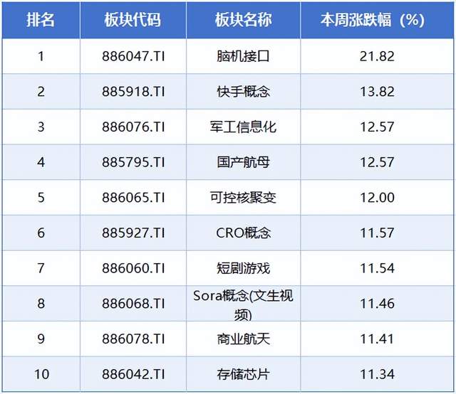 本周A股市场涨跌榜:商业航天概念持续火爆,脑机接口等轮番活跃