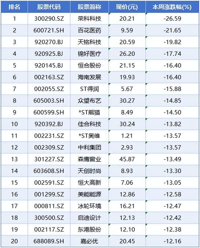 本周个股跌幅榜前五位分别是荣科科技、百花医药、天铭科技、锦好医疗、恒合股份,累计跌幅分别为26.59%、21.65%、19.82%、17.74%、16.40%。