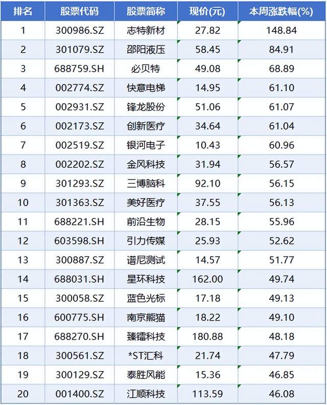 个股方面,本周个股涨幅榜前五位分别是志特新材、邵阳液压、必贝特、快意电梯、锋龙股份,累计涨幅分别为148.84%、84.91%、68.89%、61.10%、61.07%。