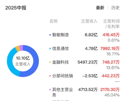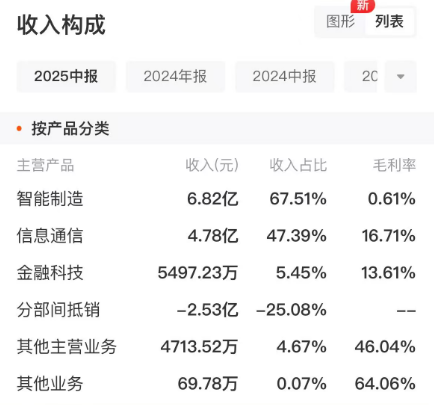 根据2025年半年报,东方通信的智能制造业务实现营收6.82亿元,占比达到67.51%;信息通信业务实现营收4.78亿元,占比为47.39%;金融科技业务实现营收0.55亿元,占比为5.45%。