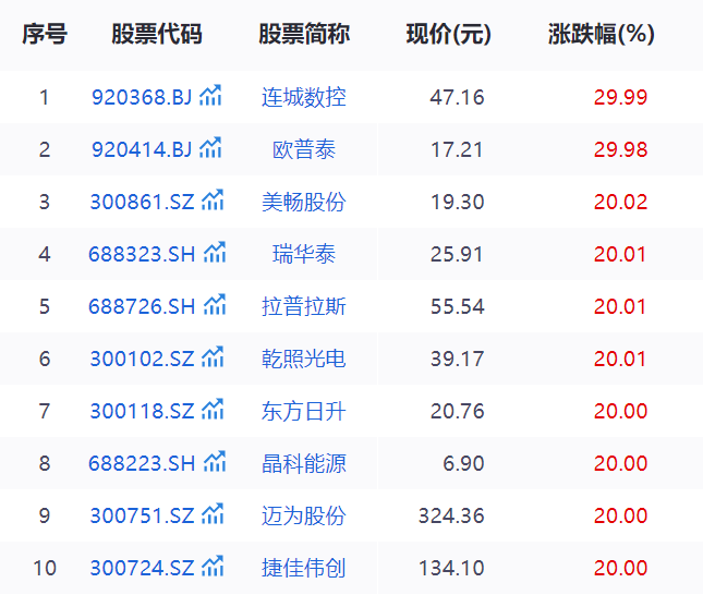 截至收盘,连城数控(920368.BJ)、欧普泰(920414.BJ)、美畅股份(300861.SZ)、瑞华泰(688323.SH)、拉普拉斯(688726.SH)、乾照光电(300102.SZ)、晶科能源(688223.SH)、琏升科技(300051.SZ)、东方日升(300118.SZ)、捷佳伟创(300724.SZ)、迈为股份(300751.SZ)、爱旭股份(600732.SH)、江苏有线(600959.SH)、正泰电源(002150.SZ)、钧达股份(002865.SZ)、鑫铂股份(003038.SZ)等30余只概念股批量涨停。