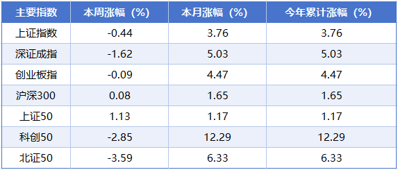 指数层面,本周A股主要指数以调整为主,其中上证50表现相对强势,本周累计上涨1.13%,沪深300同步小幅收涨,累计涨幅为0.08%。与之形成对应的是,北证50、科创50本周调整幅度较为明显,分别累计下跌3.59%和2.85%。从月度表现来看,科创50以12.29%的累计涨幅领跑各大指数,北证50、深证成指等紧随其后,累计涨幅分别为6.33%、5.03%。