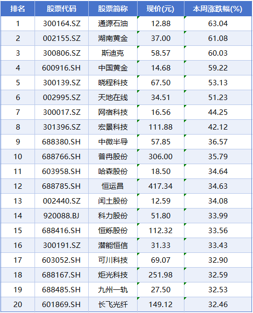 个股方面,本周个股涨幅榜前五位分别是通源石油、湖南黄金、斯迪克、中国黄金、晓程科技,累计涨幅分别为63.04%、61.08%、60.03%、59.22%、53.13%。