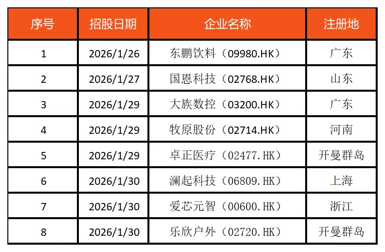 2026年1月26日—2026年2月1日,东鹏饮料、国恩科技、大族数控、牧原股份、卓正医疗、澜起科技、爱芯元智、乐欣户外8家企业招股,全球发售。