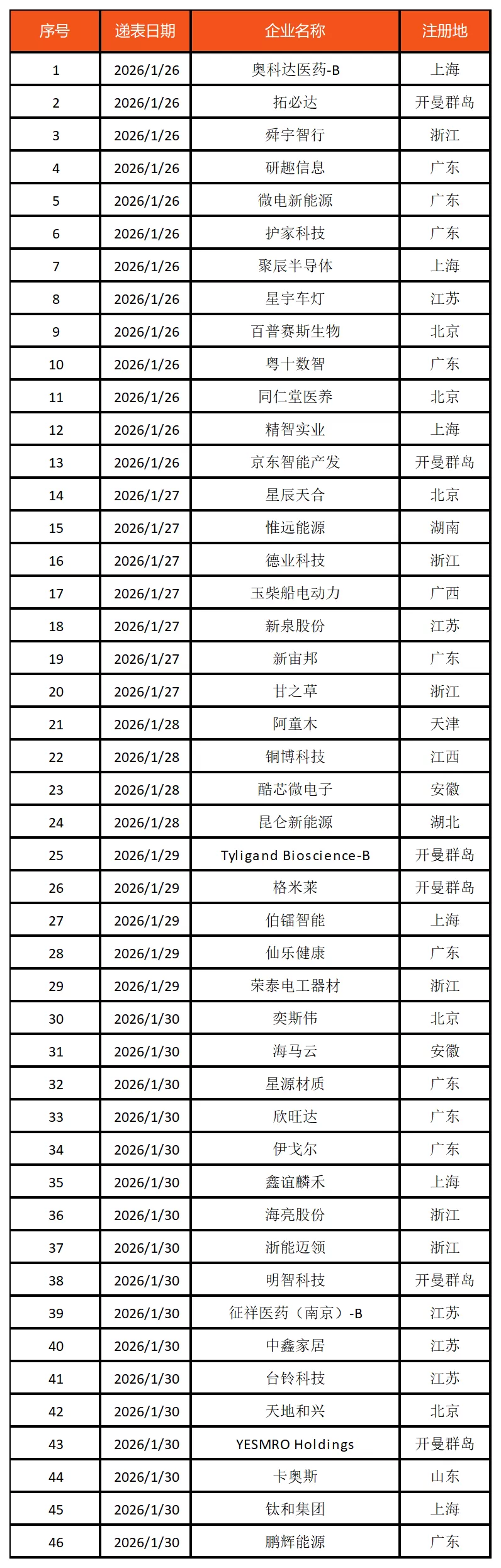 2026年1月26日—2026年2月1日,港交所共有四十六家企业递表,拟主板IPO,他们分别是:奥科达医药-B、拓必达、舜宇智行、研趣信息、微电新能源、护家科技、聚辰半导体、星宇车灯、百普赛斯生物、粤十数智、同仁堂医养、精智实业、京东智能产发、星辰天合、惟远能源、德业科技、玉柴船电动力、新泉股份、新宙邦、甘之草、阿童木、铜博科技、酷芯微电子、昆仑新能源、Tyligand Bioscience-B、格米莱、伯镭智能、仙乐健康、荣泰电工器材、奕斯伟、海马云、星源材质、欣旺达、伊戈尔、鑫谊麟禾、海亮股份、浙能迈领、明智科技、征祥医药(南京)-B、中鑫家居、台铃科技、天地和兴、YESMRO Holdings、卡奥斯、钛和集团、鹏辉能源。