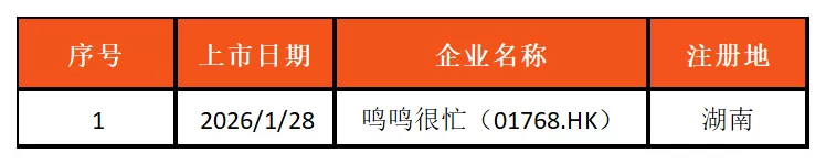 2026年1月26日—2026年2月1日,鸣鸣很忙(01768.HK)1家企业成功登陆港交所。