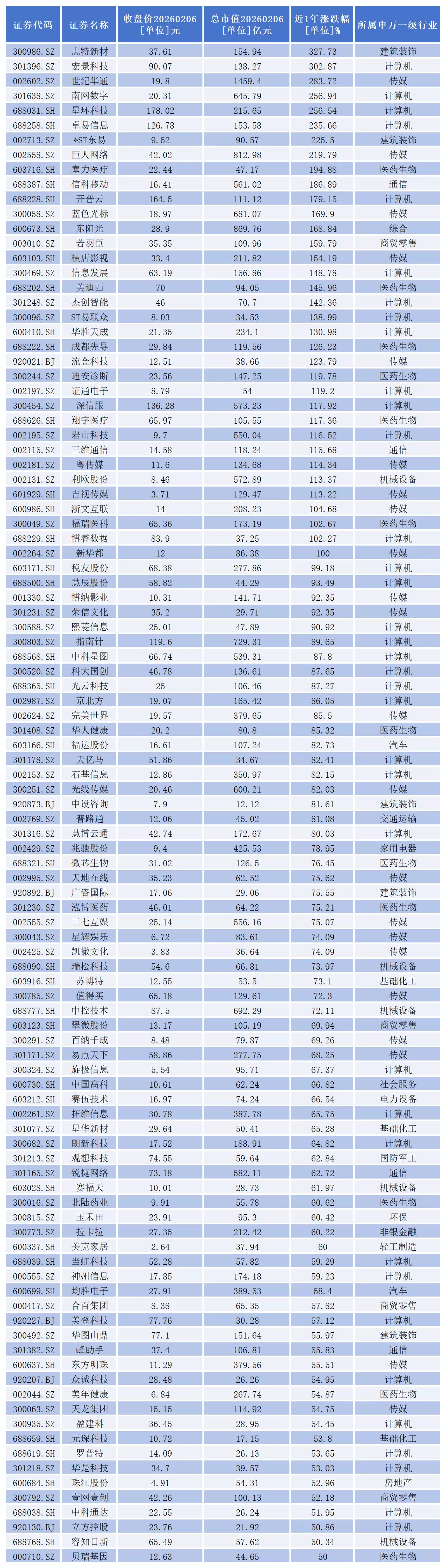 其中,志特新材(300986.SZ)、 宏景科技(301396.SZ)、世纪华通(002602.SZ)、南网数字(301638.SZ)、星环科技(688031.SH)、卓易信息(688258.SH)、*ST东易(002713.SZ)、巨人网络(002558.SZ)、塞力医疗(603716.SH)、信科移动(688387.SH)、开普云(688228.SH)、蓝色光标(300058.SZ)、东阳光(600673.SH)等35家公司近一年股价成功实现翻倍。