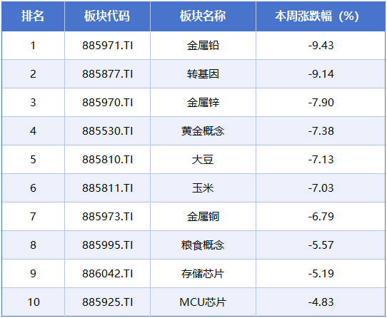 本周排在跌幅榜前排的概念板块分别是金属铅、转基因、金属锌、黄金概念、大豆,累计跌幅分别为9.43%、9.14%、7.90%、7.38%、7.13%。