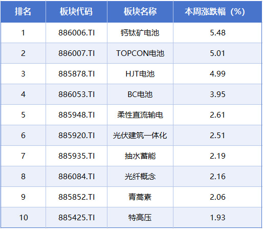 板块方面,本周涨幅居前的概念板块分别是钙钛矿电池、TOPCon电池、HJT电池、BC电池、柔性直流输电,累计涨幅分别为5.48%、5.01%、4.99%、3.95%、2.61%。