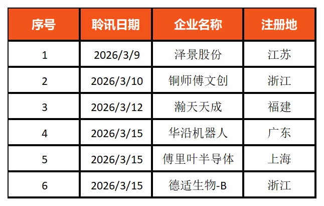 2026年3月9日—3月15日,共有泽景股份、铜师傅文创、瀚天天成、华沿机器人、德适生物-B、傅里叶半导体6家企业通过港交所上市聆讯。