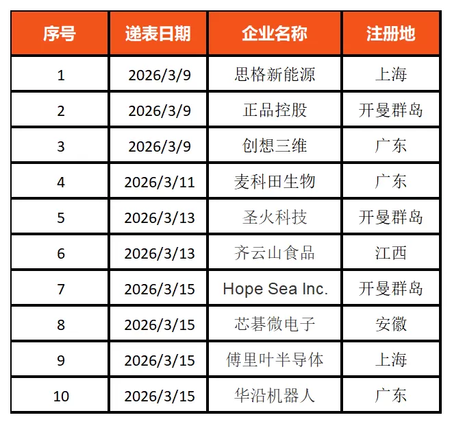 2026年3月9日—3月15日,港交所共受理10家企业主板的上市申请。分别为:思格新能源、正品控股、创想三维、麦科田生物、圣火科技、齐云山食品、Hope Sea Inc.、芯碁微电子、傅里叶半导体、华沿机器人。