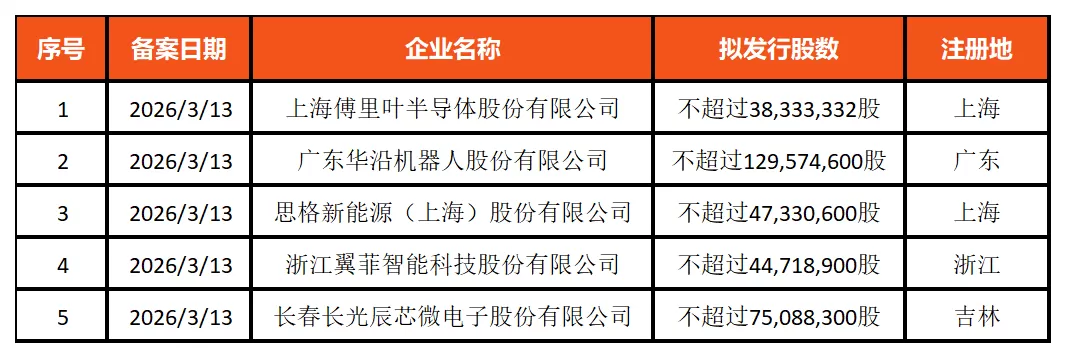 2026年3月9日至2026年3月15日,共有5家企业取得中国证监会国际合作司出具的境外发行上市备案通知书。