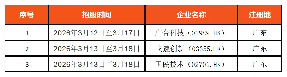 2026年3月9日—3月15日,广合科技(01989.HK)、飞速创新(03355.HK)、国民技术(02701.HK)3家企业开启招股。
