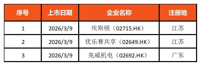 2026年3月9日—3月15日,埃斯顿、优乐赛共享、兆威机电3家企业正式登陆港交所。