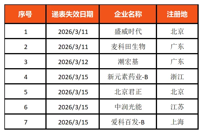 2026年3月9日—3月15日,按照港交所规定,因未在递表后6个月内完成聆讯或上市,共有7家企业当次递表失效。分别为:盛威时代、麦科田生物医疗、潮宏基、新元素药业-B、北京君正、中润光能、爱科百发-B。
