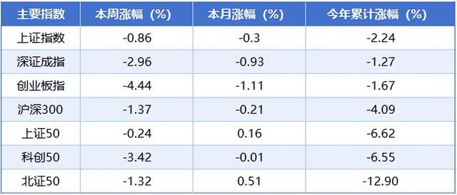 指数层面,本周A股主要指数延续调整态势。具体来看,创业板指回调幅度最为显著,周跌幅达到4.44%,科创50和深证成指紧随其后,本周累计跌幅分别为3.42%、2.96%。相比之下,上证50指数的表现相对抗跌,本周仅下跌0.24%。从年度涨幅来看,各大指数全部由涨转跌,其中北证50等指数的跌幅尤为明显。