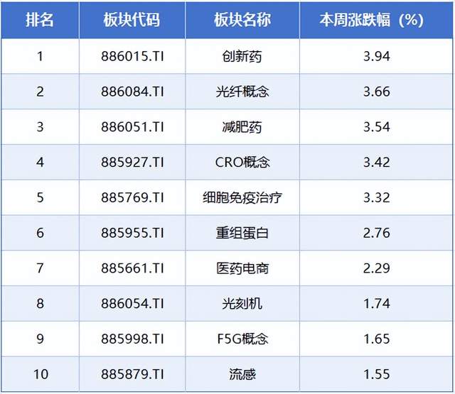 板块方面,本周涨幅居前的概念板块分别是创新药、光纤概念、减肥药、CRO概念、细胞免疫治疗,累计涨幅分别为3.94%、3.66%、3.54%、3.42%、3.32%。