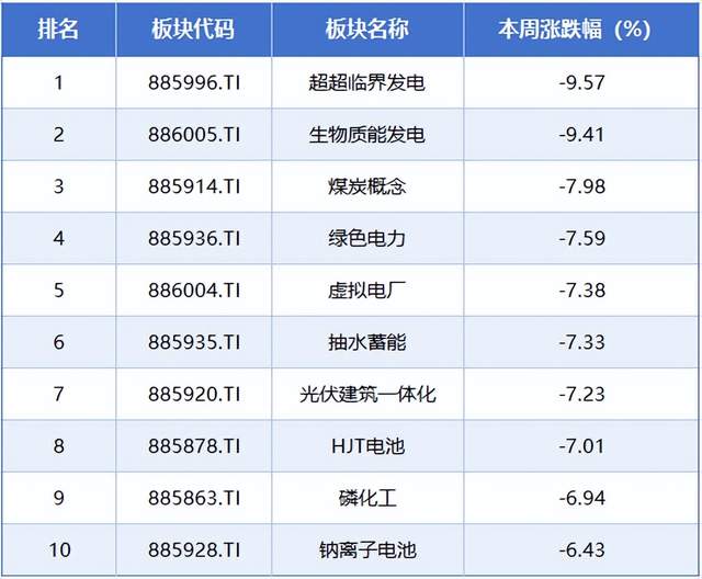 本周排在跌幅榜前排的概念板块分别是超超临界发电、生物质能发电、煤炭概念、绿色电力、虚拟电厂,累计跌幅分别为9.57%、9.41%、7.98%、7.59%、7.38%。