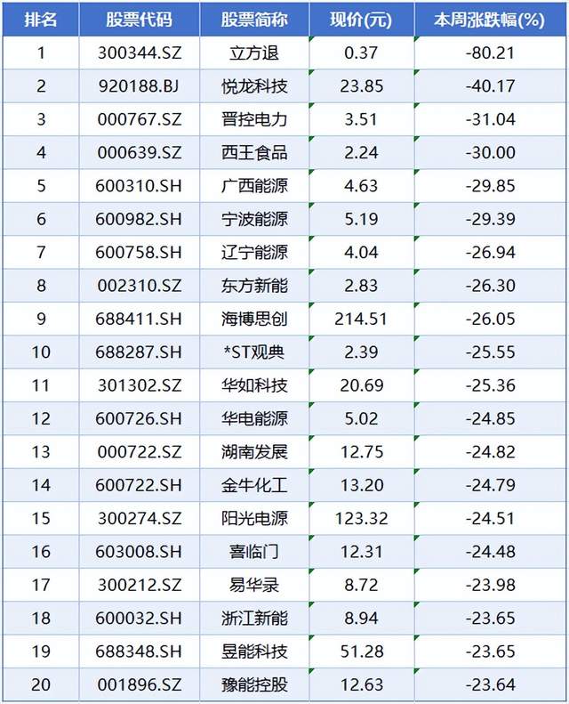 本周个股跌幅榜前五位分别是立方退、悦龙科技、晋控电力、西王食品、广西能源,累计跌幅分别为80.21%、40.17%、31.04%、30%、29.85%。