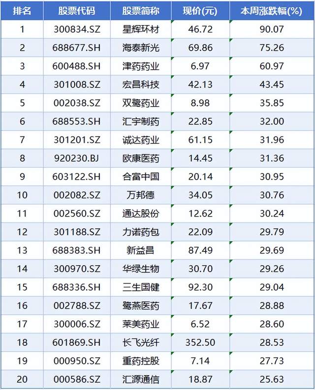 个股方面,本周个股涨幅榜前五位分别是星辉环材、海泰新光、津药药业、宏昌科技、双鹭药业,累计涨幅分别为90.07%、75.26%、60.97%、43.45%、35.85%。
