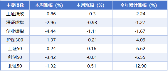 指数层面,本周A股主要指数延续调整态势。具体来看,创业板指回调幅度最为显著,周跌幅达到4.44%,科创50和深证成指紧随其后,本周累计跌幅分别为3.42%、2.96%。相比之下,上证50指数的表现相对抗跌,本周仅下跌0.24%。从年度涨幅来看,各大指数全部由涨转跌,其中北证50等指数的跌幅尤为明显。