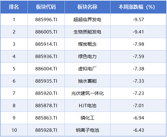 本周排在跌幅榜前排的概念板块分别是超超临界发电、生物质能发电、煤炭概念、绿色电力、虚拟电厂,累计跌幅分别为9.57%、9.41%、7.98%、7.59%、7.38%。