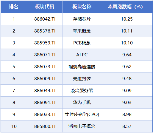 板块方面,本周涨幅居前的概念板块分别是存储芯片、苹果概念、PCB概念、AI PC、铜缆高速连接,累计涨幅分别为10.25%、10.11%、10.10%、9.64%、9.62%。