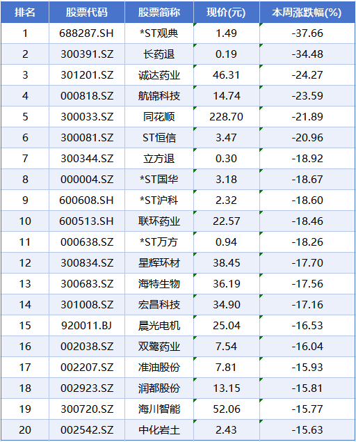 本周个股跌幅榜前五位分别是*ST观典、长药退、诚达药业、航锦科技、同花顺,累计跌幅分别为37.66%、34.48%、24.27%、23.59%、21.89%。