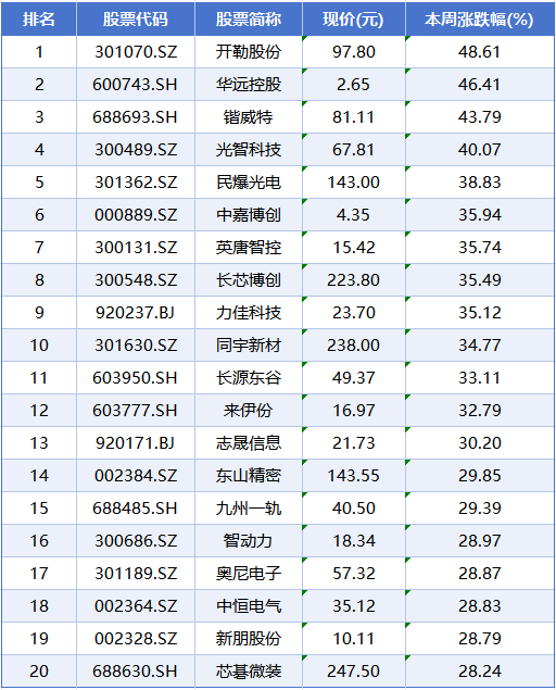 个股方面,本周个股涨幅榜前五位分别是开勒股份、华远控股、锴威特、光智科技、民爆光电,累计涨幅分别为48.61%、46.41%、43.79%、40.07%、38.83%。