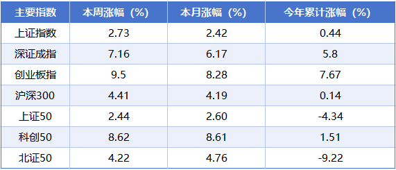 本周(4月7日至4月10日),A股三大指数全部收红。截至周五收盘,上证指数累计上涨2.73%,深证成指累计上涨7.16%,创业板指累计上涨9.5%。