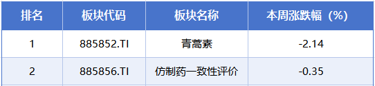 本周仅2个板块迎来回调,分别是青蒿素、仿制药一致性评价,累计跌幅分别为2.14%、0.35%。