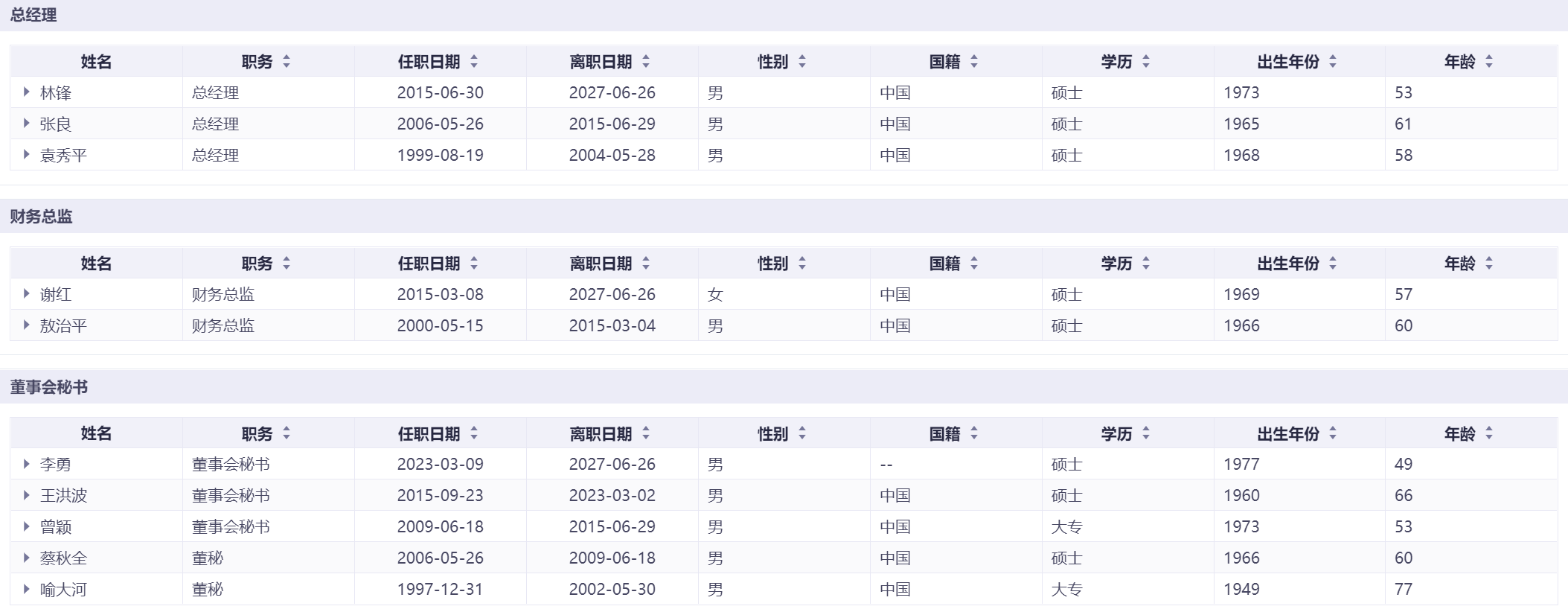 公司财务总监2004年至今更换4任,2022年至2024年两年内两度换人;董事会秘书1998年至今历经彭智辅、蒋琳、章欣3任,2022年至2024年三年两换,经营层与关键岗位短期考核特征显著。