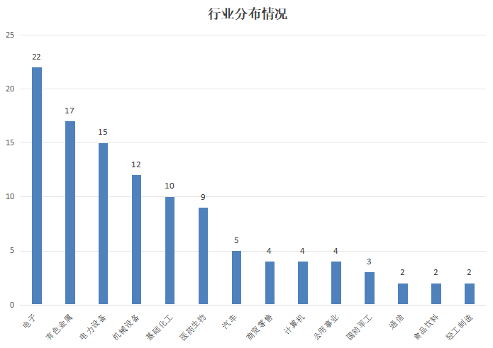 在2026年第一季度业绩预喜的上市公司中,电子行业有22家,有色金属17家,电力设备15家,机械设备12家,基础化工10家。