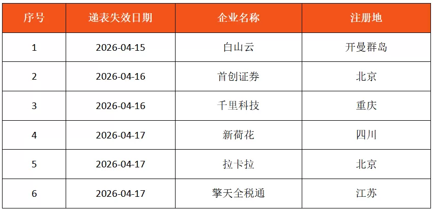根据港交所相关规定,企业递表后若未能在6个月内完成聆讯或挂牌,其上市申请状态将自动变更为“失效”(失效后可重新递表)。本期共有6家企业因此变更为失效状态,具体名单如下: