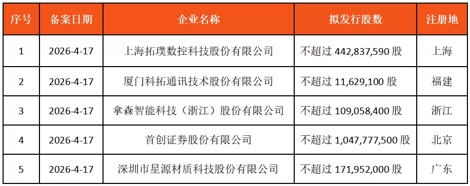 本期5 家企业取得中国证监会国际合作司出具的境外发行上市备案通知书,详情如下: