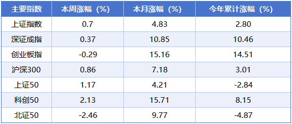 指数层面,本周A股主要指数走势分化,涨跌互现。其中,科创50、上证50的表现相对较强,本周累计涨幅分别为2.13%、1.17%,沪深300与上证指数同样录得周度正收益;反观北证50走势偏弱,本周累计回落2.46%。从年内表现来看,创业板指领跑各大指数,累计涨幅达到14.51%,深证成指以10.46%的累计涨幅紧随其后。值得注意的是,北证50、上证50年内依然承压,累计涨幅仍为负值