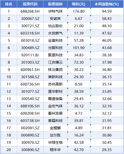 个股方面,本周个股涨幅榜前五位分别是华特气体、安诺其、怡达股份、水发燃气、金富科技,累计涨幅分别为94.59%、58.43%、48.10%、47.92%、46.05%。