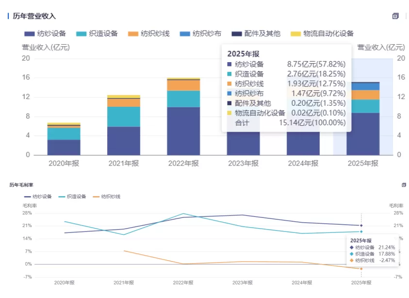 境内市场收缩时,境外业务成为重要缓冲。2025年公司境外收入同比增长超三成,转杯纺纱机、剑杆织机、喷气织机出口强劲,在“一带一路”沿线与新兴市场打开空间,有效对冲了国内下行压力。这种“国内打底、海外增量”的格局,让它在行业寒冬里,守住了基本盘。