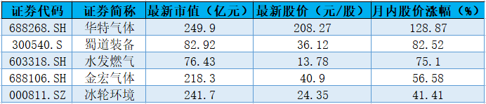 相关数据显示,截至4月28日收盘,当月15只氦气概念股有13只上涨,其中,华特气体涨幅最大,月内涨幅达到128.87%,股价已实现翻倍;紧随其后的是蜀道装备和水发燃气,月内涨幅分别为82.52%和75.10%。