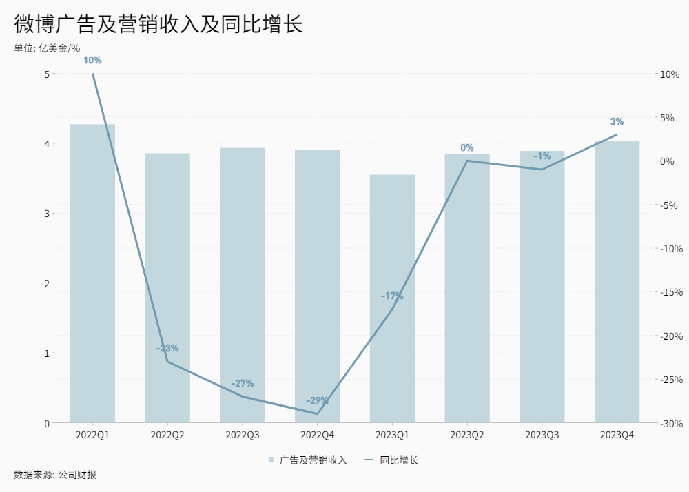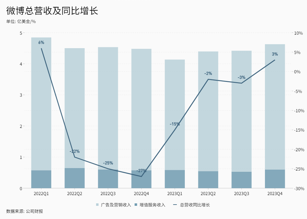 3 月 14 日发布的财报显示,微博 2023 全年总营收 17.6 亿美元,调整后营业利润 5.921 亿美元。2023 年 Q4 总营收 4.637 亿美元,同比增长 3%。Q4 调整后营业利润 1.459 亿美元,调整后营业利润率 31%。Q4 微博月活跃用户为 5.98 亿,同比净增约 1100 万,日活跃用户达到 2.57 亿,同比净增约 500 万。