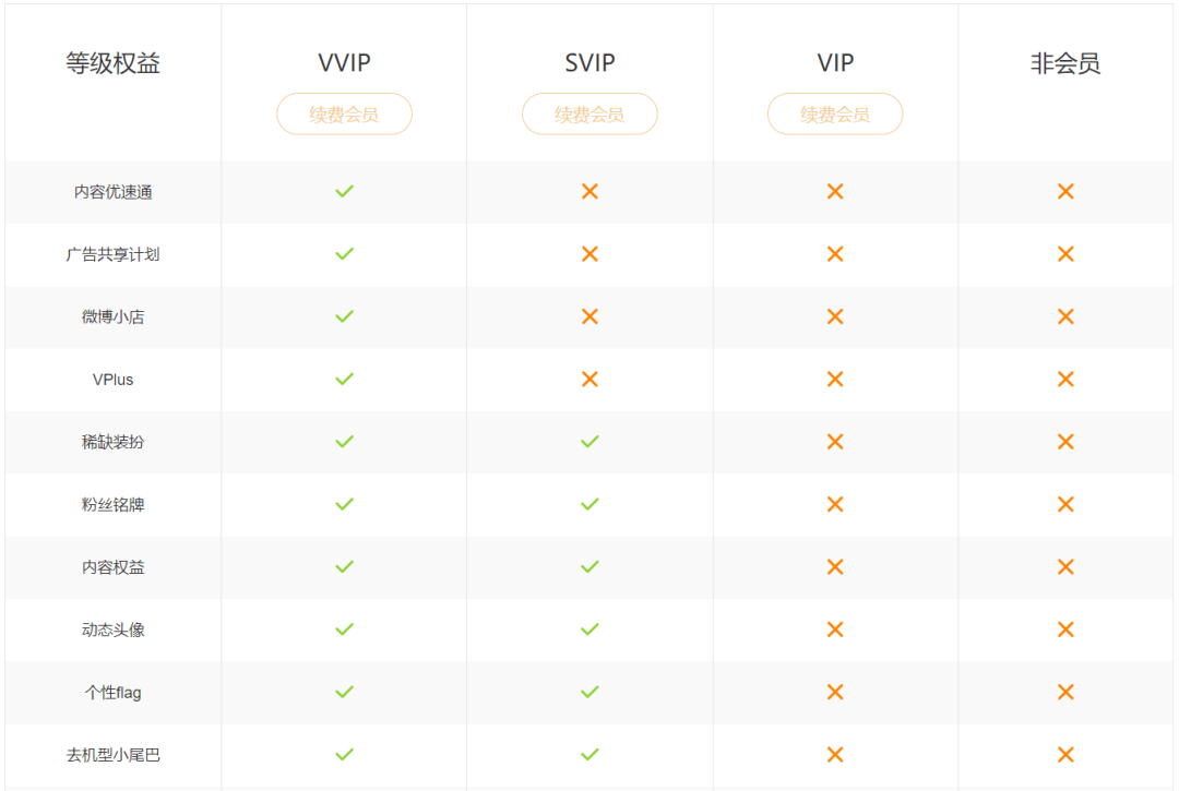 增值服务的调整迎合了这一逻辑。2023 年下半年,微博在原有的 VIP/SVIP 体系外,新增 VVIP 体系,将微博小店、广告共享计划、VPlus 会员等功能整合入内。微博的三种会员里,VIP 对应普通会员、SVIP 对应社交会员、VVIP 对应创作者经营会员。如名字所示,VVIP 的独占功能都与创作者变现相关,比如“内容优速通”,可保证争议内容快速审查,实现更快速的涨粉和创收。