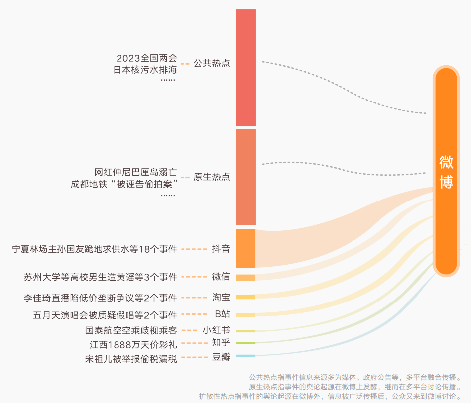 我们可以从热点事件的传播路径与后续发酵中理解这种优势。当下, 用户越来越习惯于使用多个社交媒体,在不同平台间切换、游牧,微博不再是“热点原生地”,但仍然是热点扩撒的“讨论聚合器”。