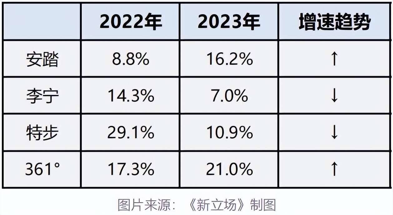 安踏不仅在规模上位居榜首,其增长速度也在持续加快,2022年增长率为8.8%,到了2023年提升至16.2%;而李宁和特步的增长速度有所减缓,361度的增长主要得益于其儿童系列产品,但由于购买者与使用者分离,且更贴近母婴市场,因此不在此次讨论范围内。